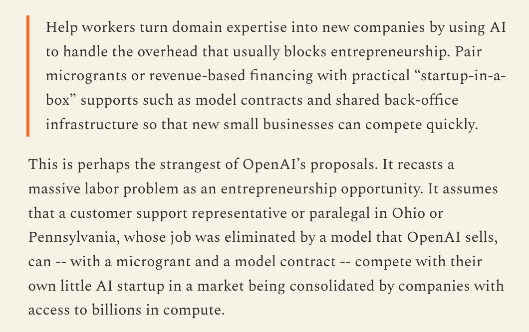 In early April, everyone celebrated the first one-person billion-dollar company, Medvi. Sam Altman wanted to meet the founder. It’s very impressive, and I applaud that founder. But I don’t like how it was quickly adopted and pitched by AI CEOs as the pinnacle of what people can do now that AI will take our white-collar jobs. It is presented as a radical leverage and individuals reclaiming agency. We will have millions of people selling millions of products to millions of people. It might signify abundance, freedom, or choice. But most likely it’s just a promotion of universal hustle. It seems to me like an acceleration of more of the same, not of human flourishing. This vision works for a few, but it can’t be a serious, major alternative to employment as AI companies propose.